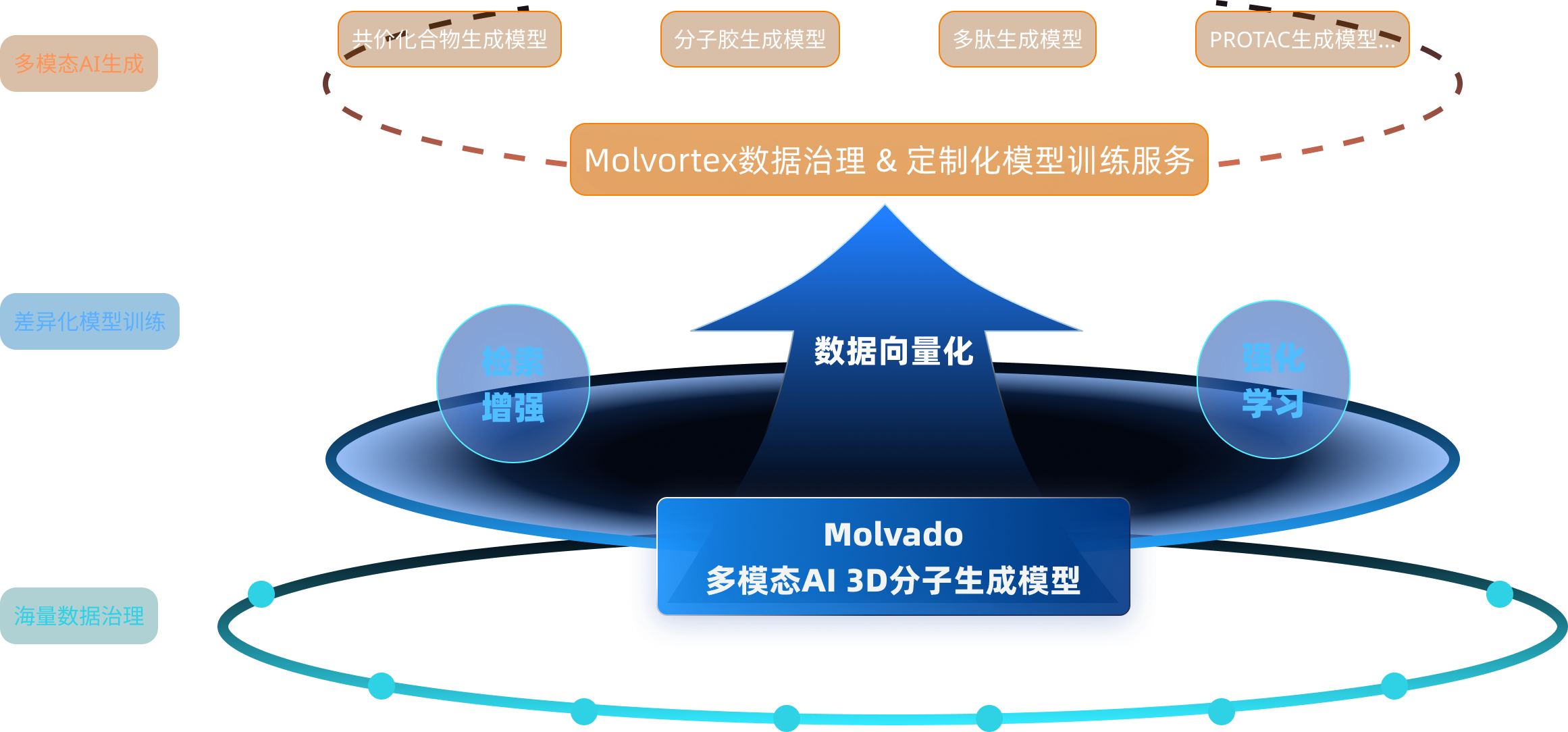以多模态 AI 3D分子生成模型为基座,基于当前管线开发需求定向采集数据并进行治理。同时通过大语言模型交互,整合湿